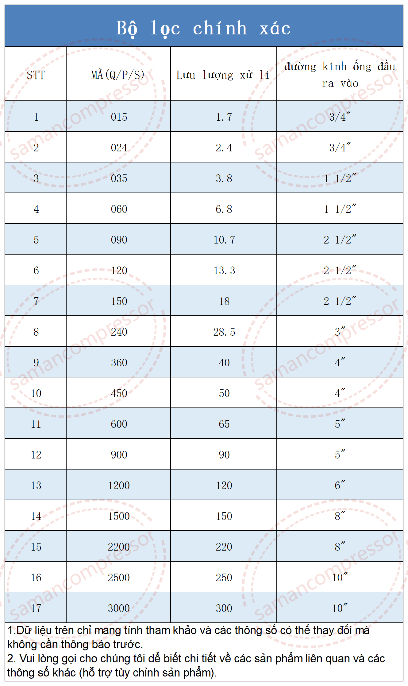 Bộ lọc trước (Q) Bộ lọc chính xác (P) Bộ lọc siêu chính xác (S)