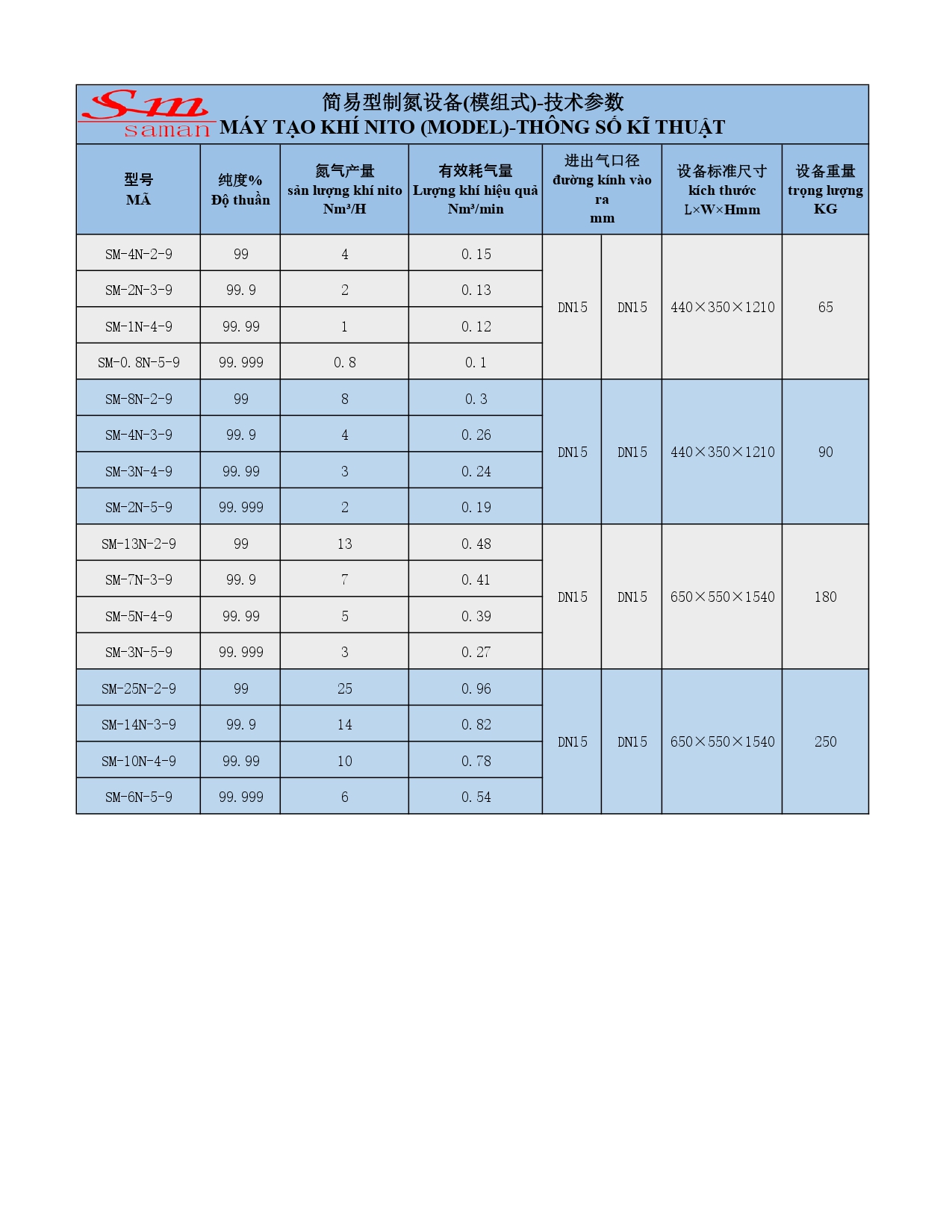 Thông Số Kỹ Thuật Máy Tạo Khí Nitơ Saman (Dòng Module)